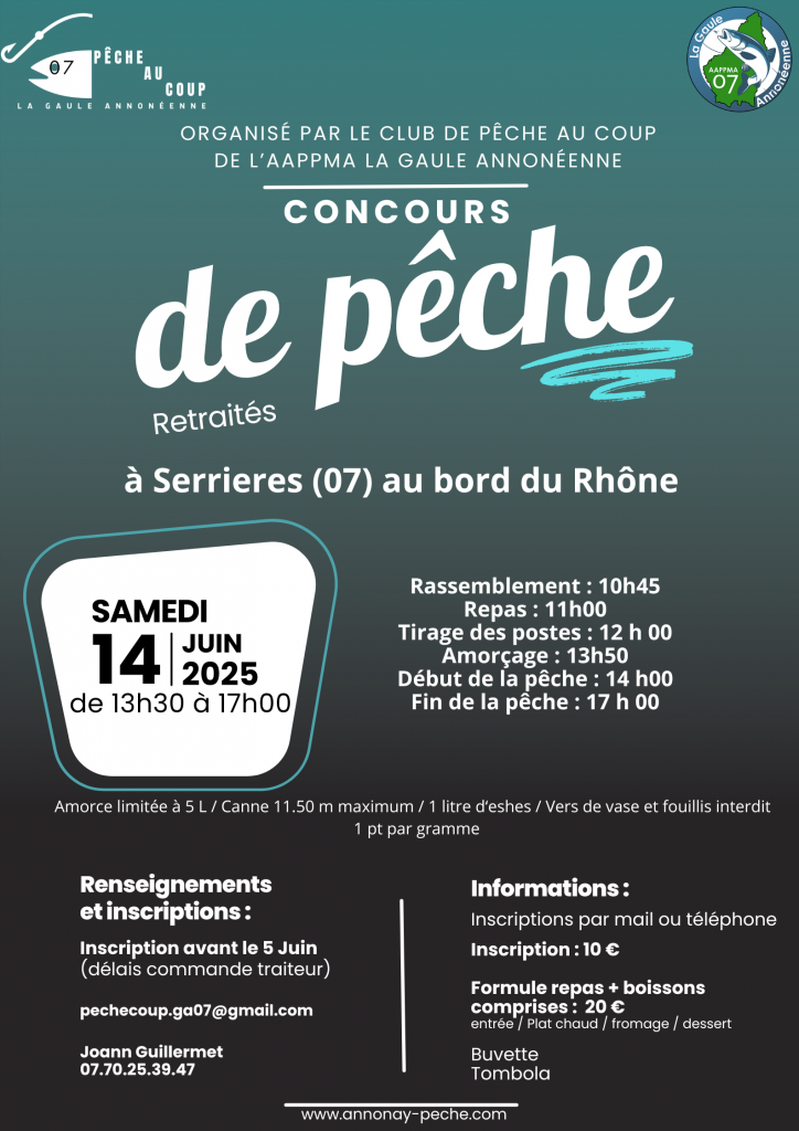 Le club de pêche au coup de la GAULE ANNONEENNE organise son concours annuel de pêche au coup à destination des retraités le 14 juin à SERRIERES.